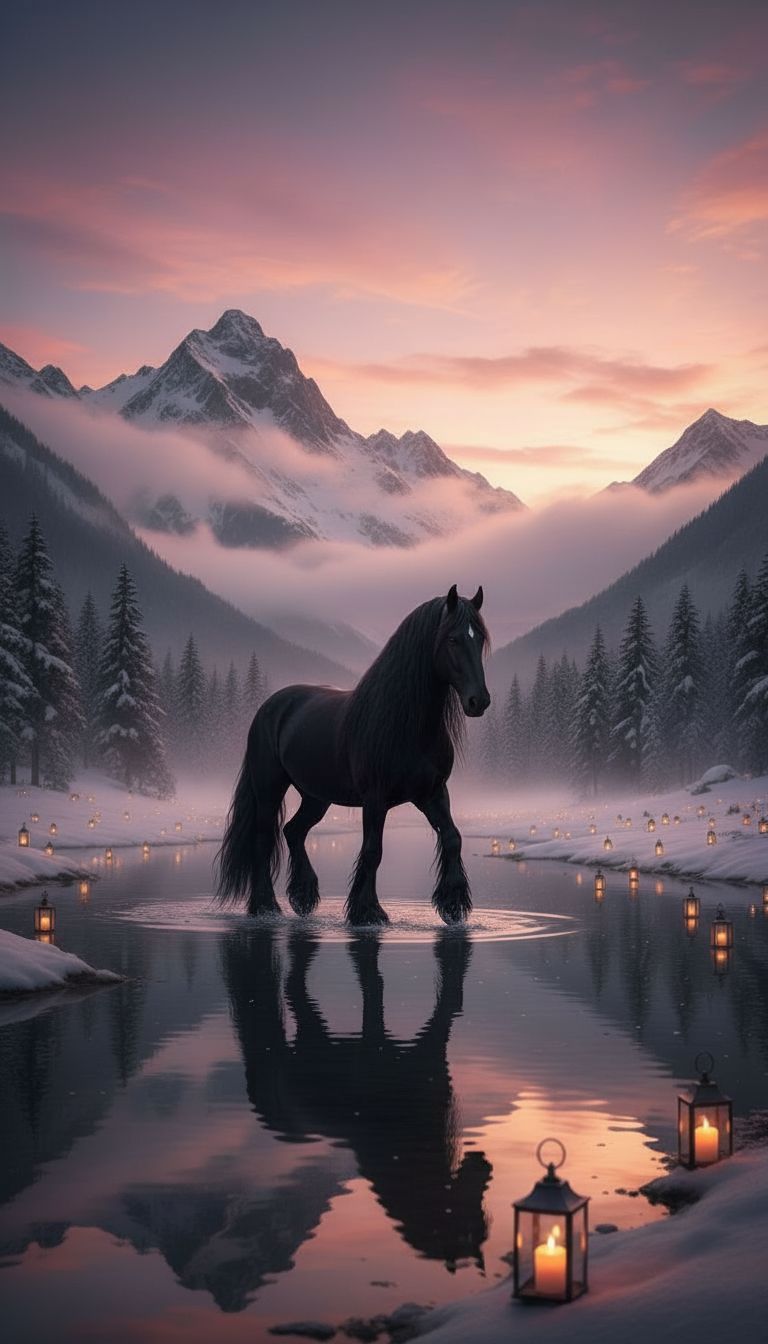 La scéne finale est un moment au coucher du soleil on voit au fond des montagnes, des nuages et une épaisse couche de brume, des sapins remplis de neige , un ciel rose , en milieu de plan un cheval c’est un cheval frison noir avec des fanons et une épaissie criniere tres fournie longue jusqu’aux pattes , il marche sur l’eau , au bord de l’eau et dans la neige partout ailleurs sont poses de petites lanternes avec de bougies . Dans l’eau on voit le reflet du cheval qui marche. le cheval n ‘a aucun enrênement et il est complètement noir.