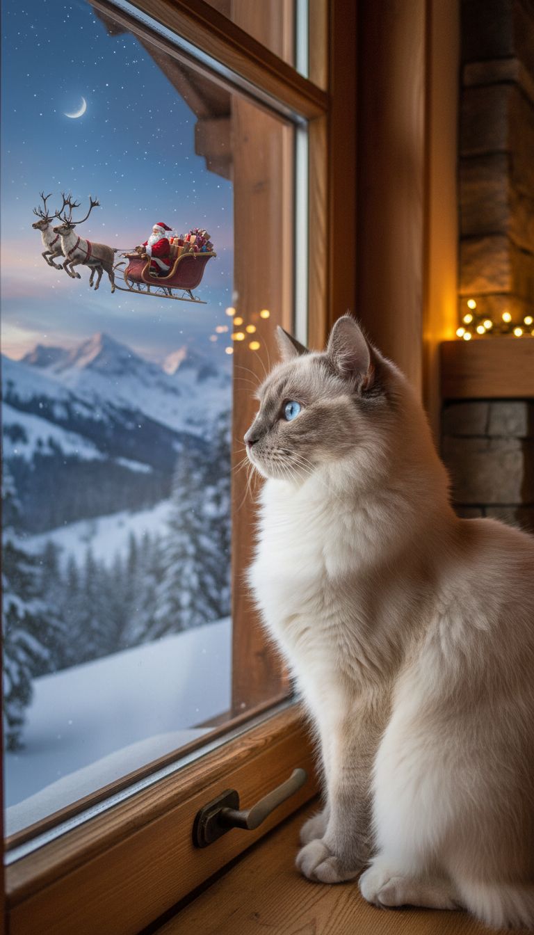 Un chat sacré de Birmanie, aux yeux bleus saphir observe le père noel à travers la vitre de sa maison, il est assis de profil derriere une jolie fenêtre en bois et il regarde le père noel passait dans le ciel avec un traineau et ses2 cerfs attelés , son traineau à l’arrière étant rempli de cadeau , il est dans un magnifique chalet en de bois dans la montage , par la fenêtre on peut également apercevoir. Le style de l’image doit être une photo ultra réaliste l’eau et dans la neige partout ailleurs sont poses de petites lanternes avec de bougies . Dans l’eau on voit le reflet du cheval qui marche. le cheval n ‘a aucun enrénement et il est complètement noir.